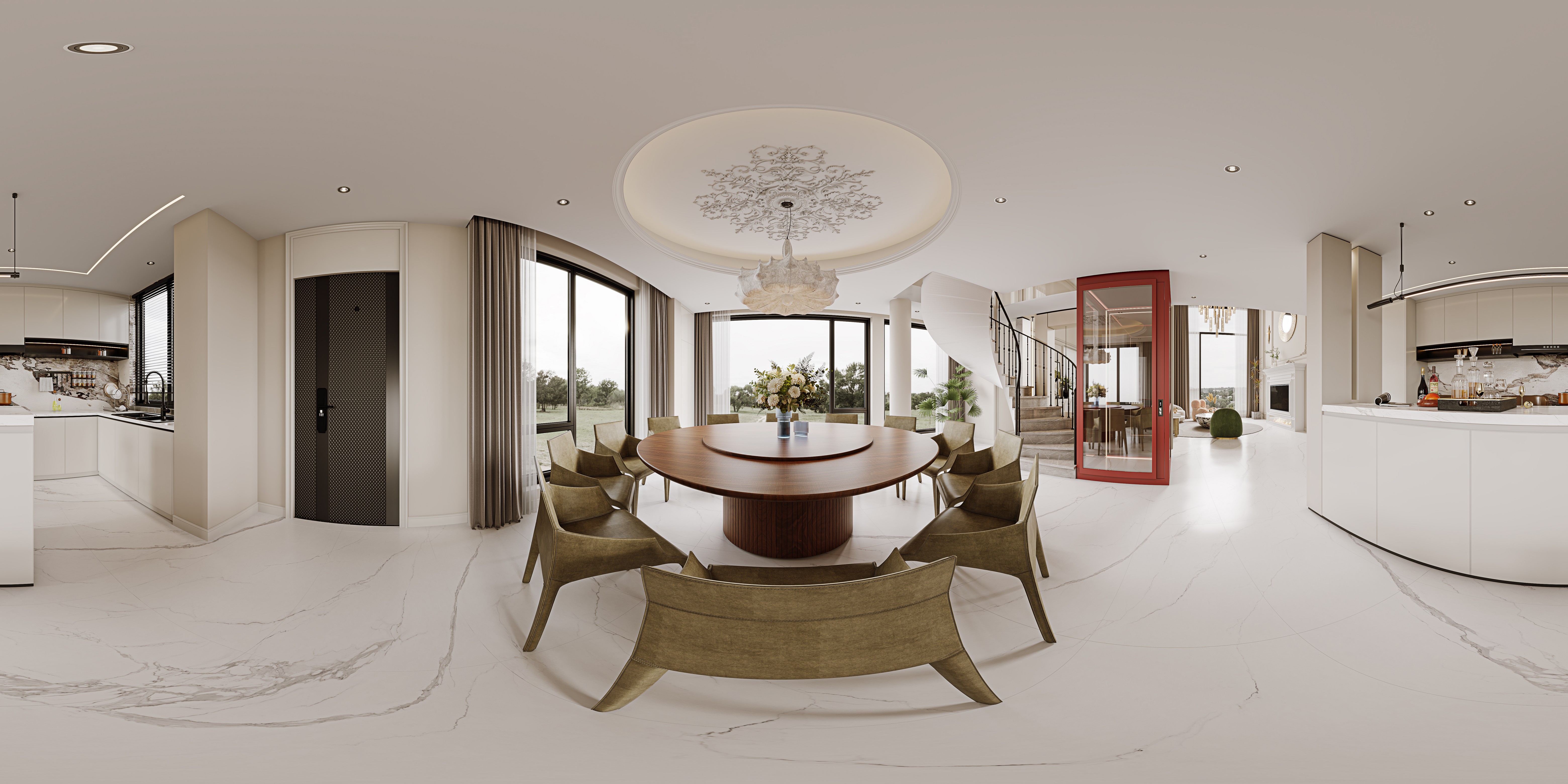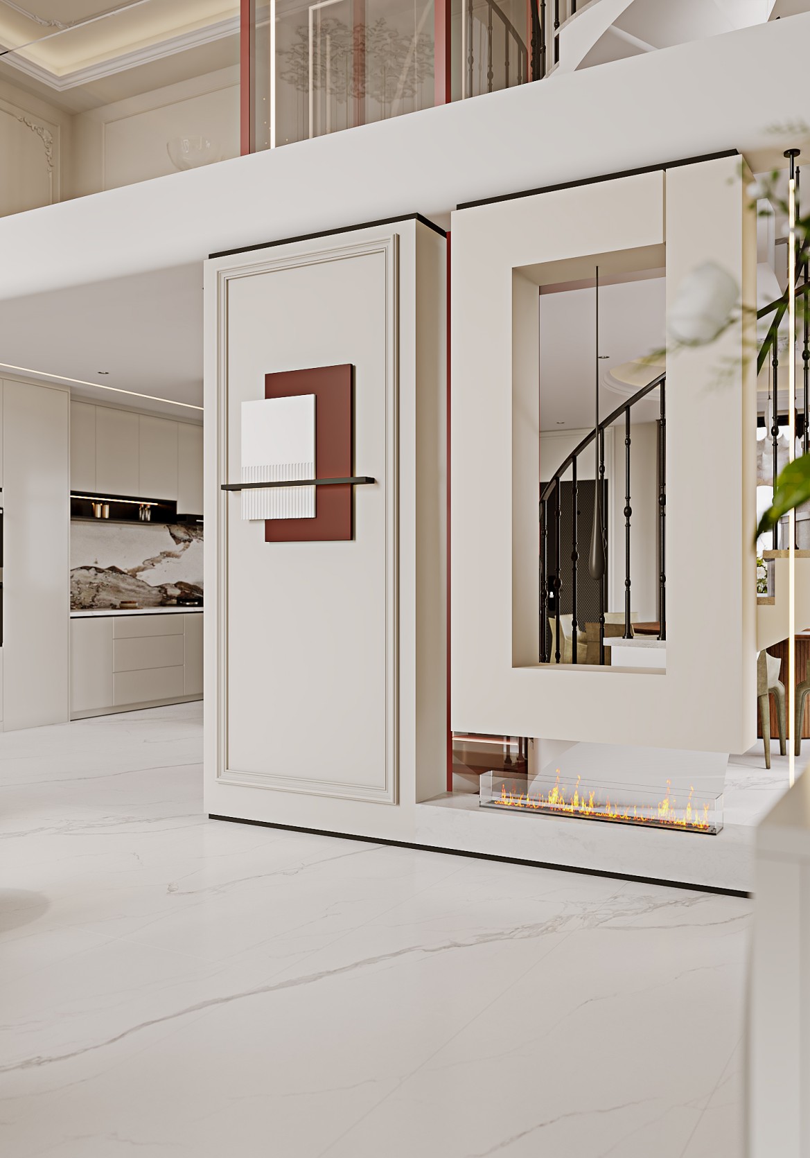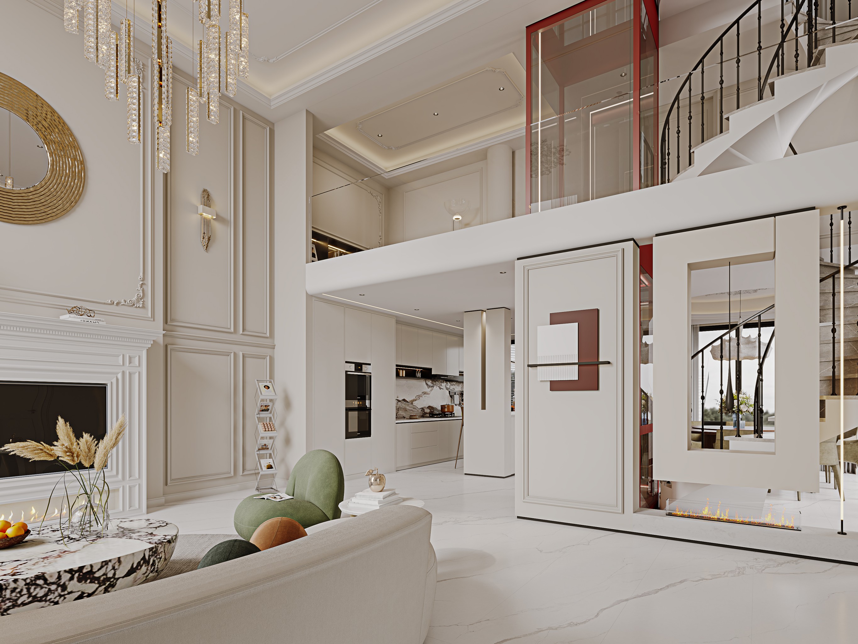 大落地窗融入户外景观,电梯采用大胆的红色使各种艺术元素得以被重新诠释,既有岁月打磨后的稳持优雅,又有精致奢华的美学风尚。