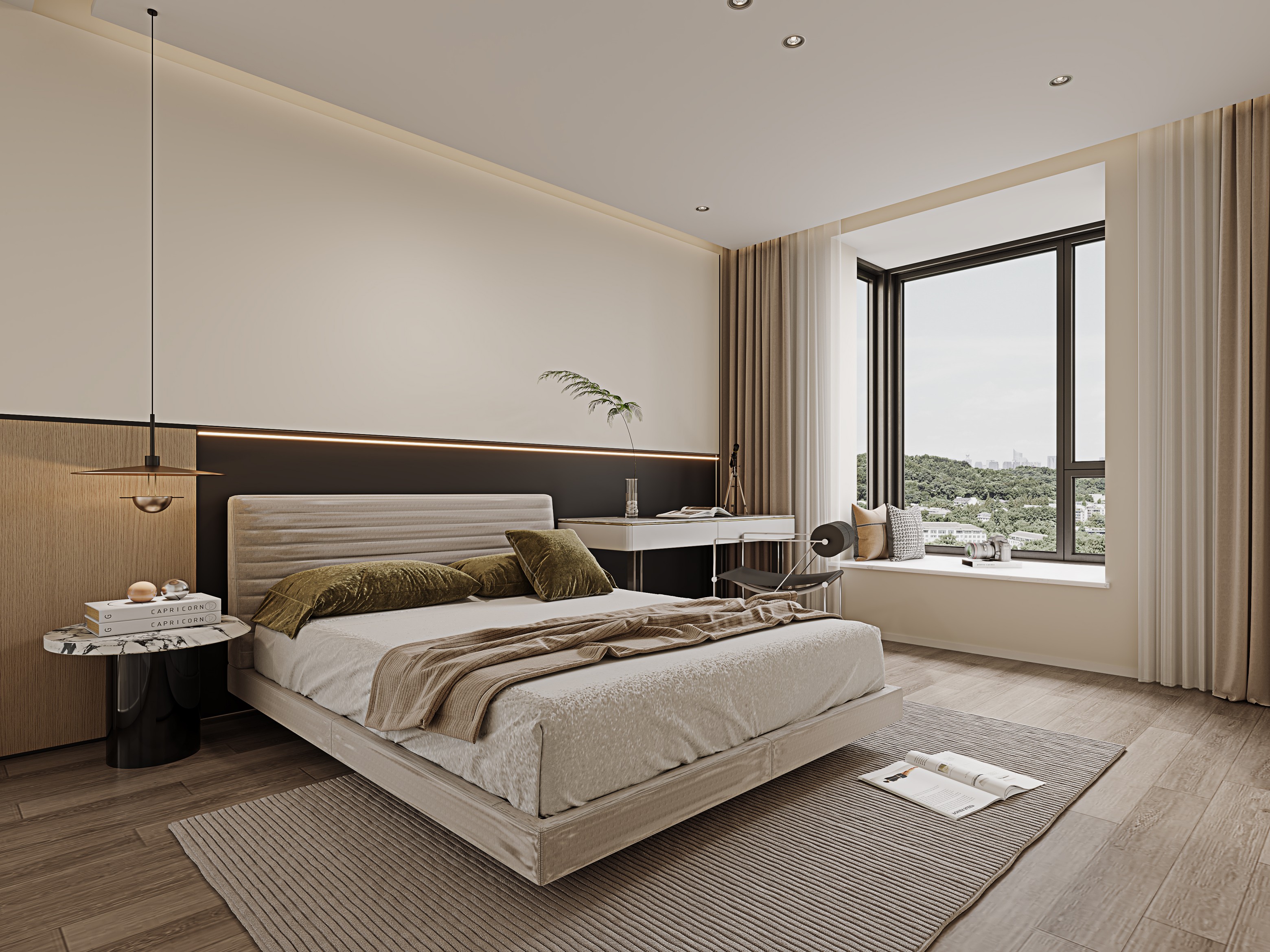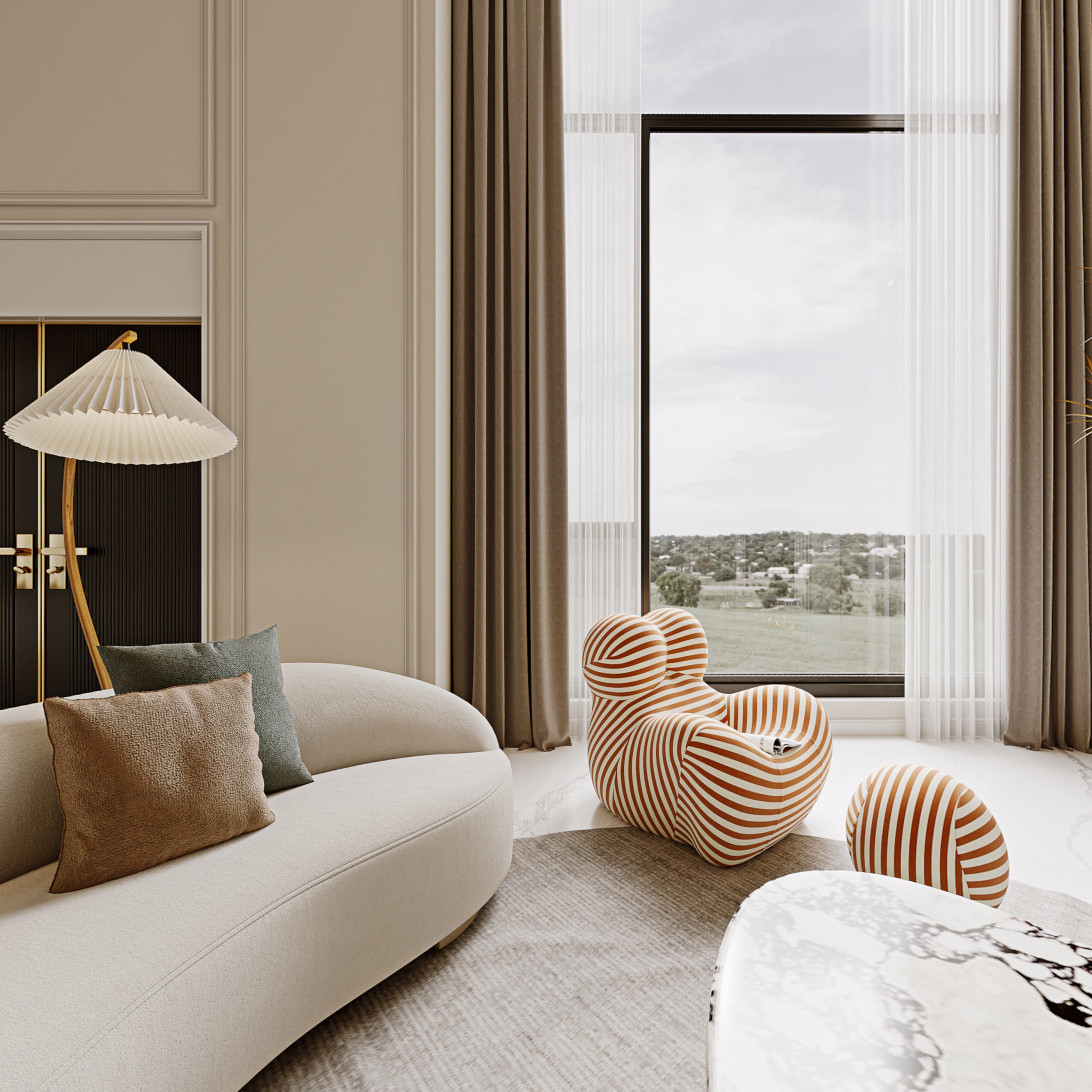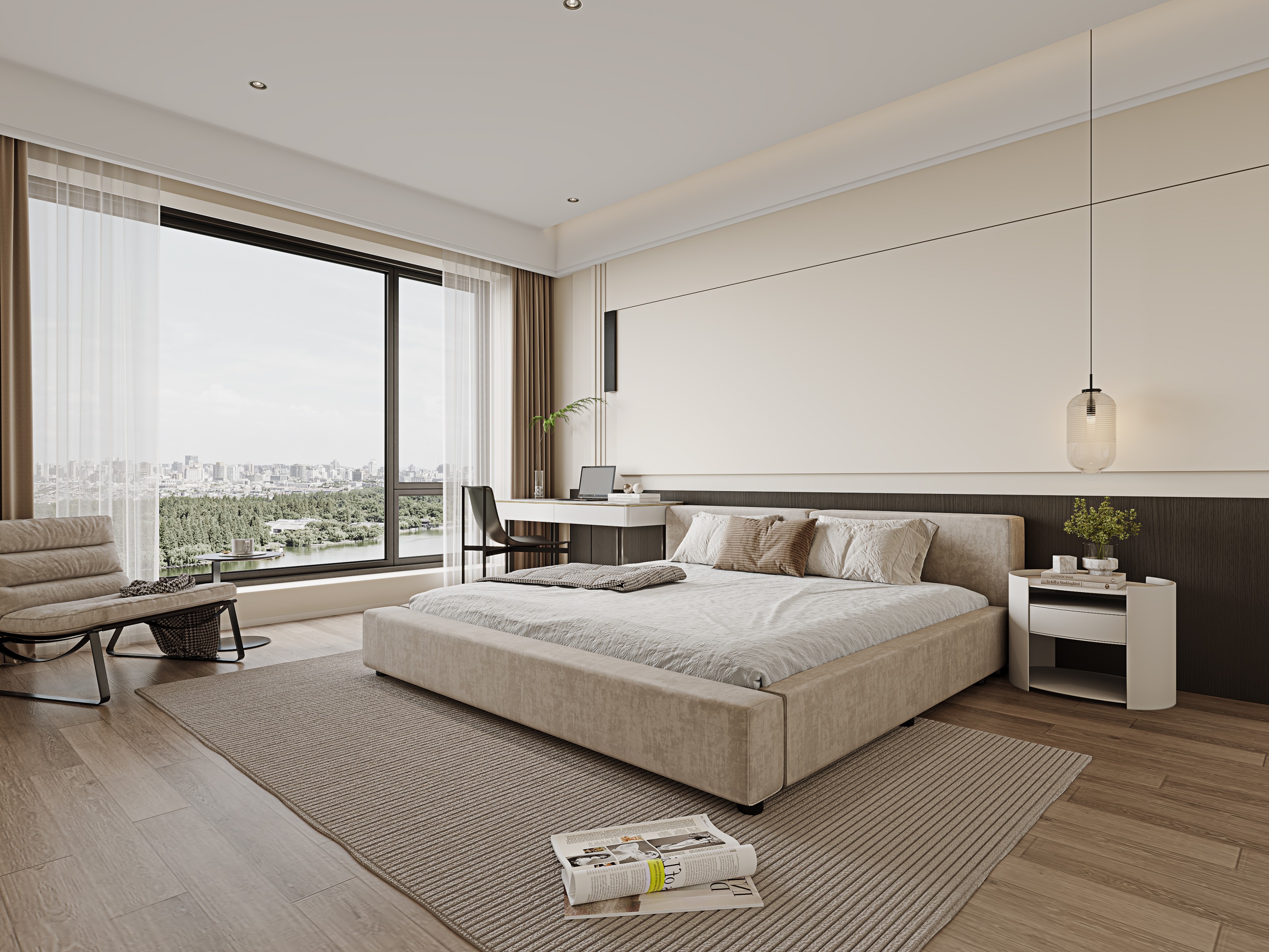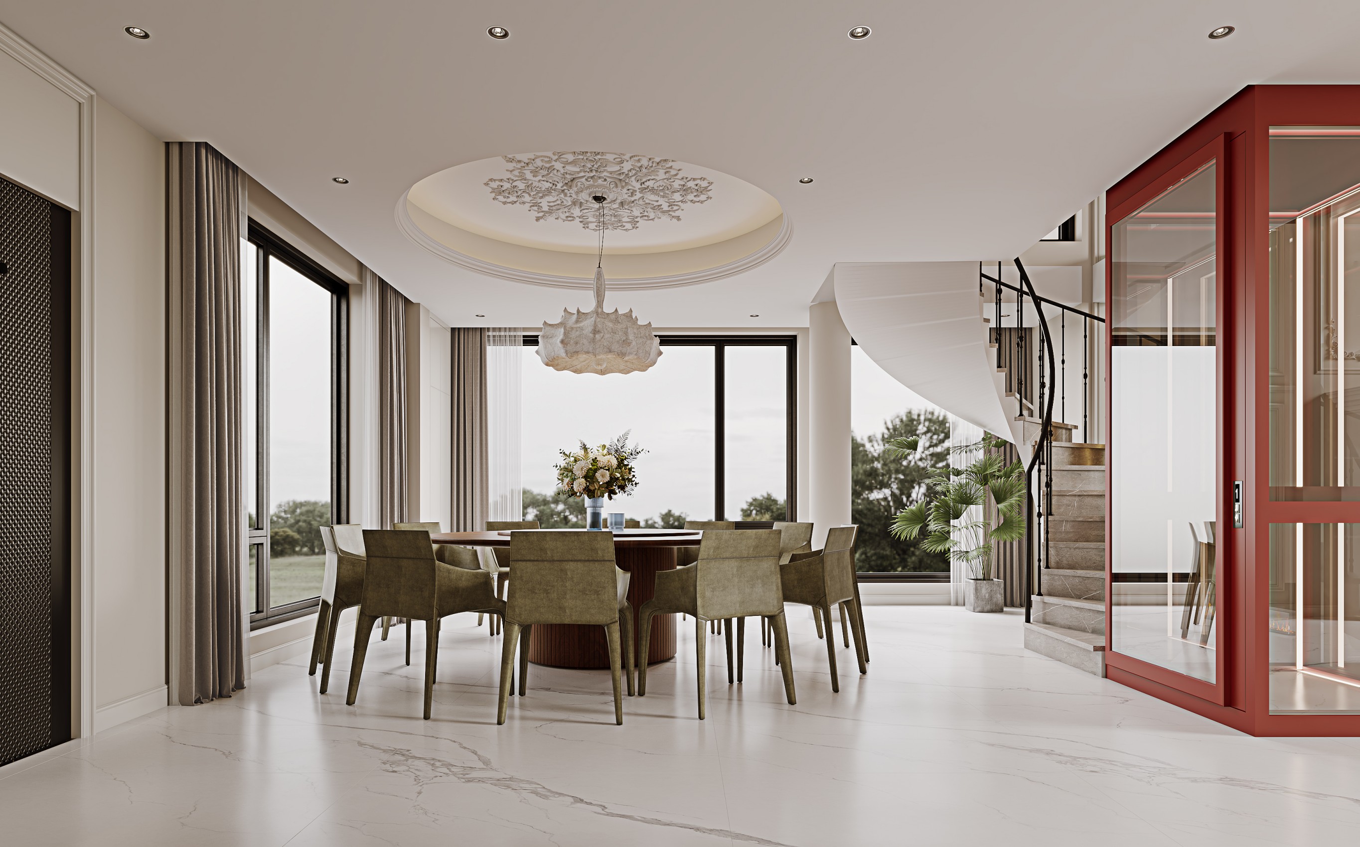 大落地窗融入户外景观,电梯采用大胆的红色使各种艺术元素得以被重新诠释,既有岁月打磨后的稳持优雅,又有精致奢华的美学风尚。