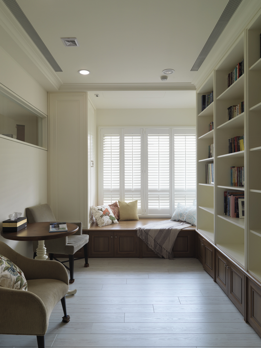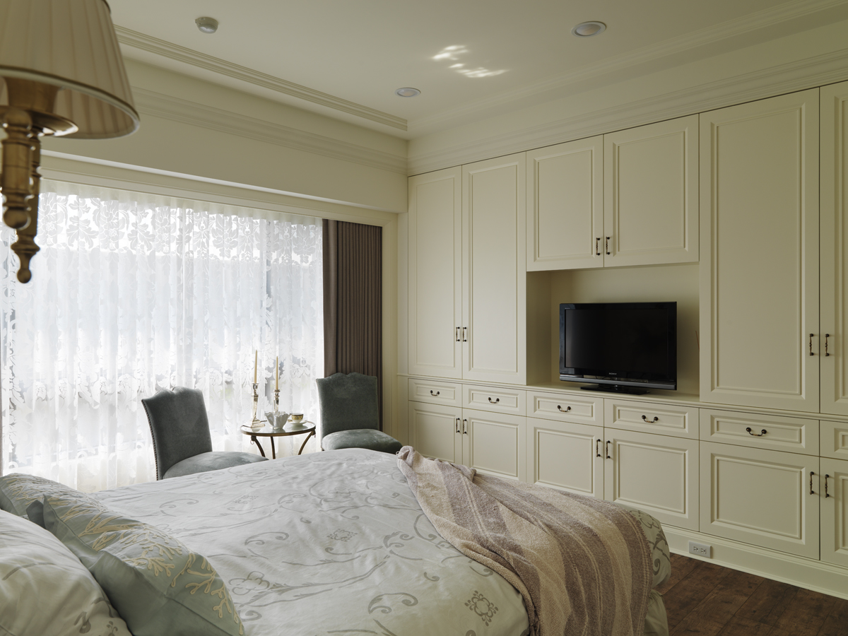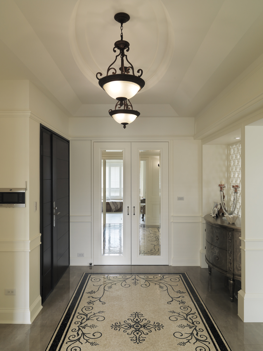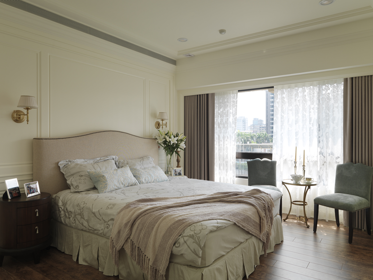 本次设计采用简约美式风格,在简约美式风格设计中,不会采用过多的色彩,凸显其稳重与温馨。玄关处的金属色装饰柜很好的融合了美式与现代风格的特点,与地面的浅色大理石拼花相呼应,主卧整体色调淡雅,结合了现代风格的简约与美式风格的浪漫。卧室多采用白色饰面与家具,不设置顶灯,利用筒灯与壁灯来满足需求,使得显得整个空间舒适、温馨、柔软。本次设计在家具油漆上,一般都以单一色为主,展现其独特的浪漫情怀,没有过多刻意的雕琢与约束。