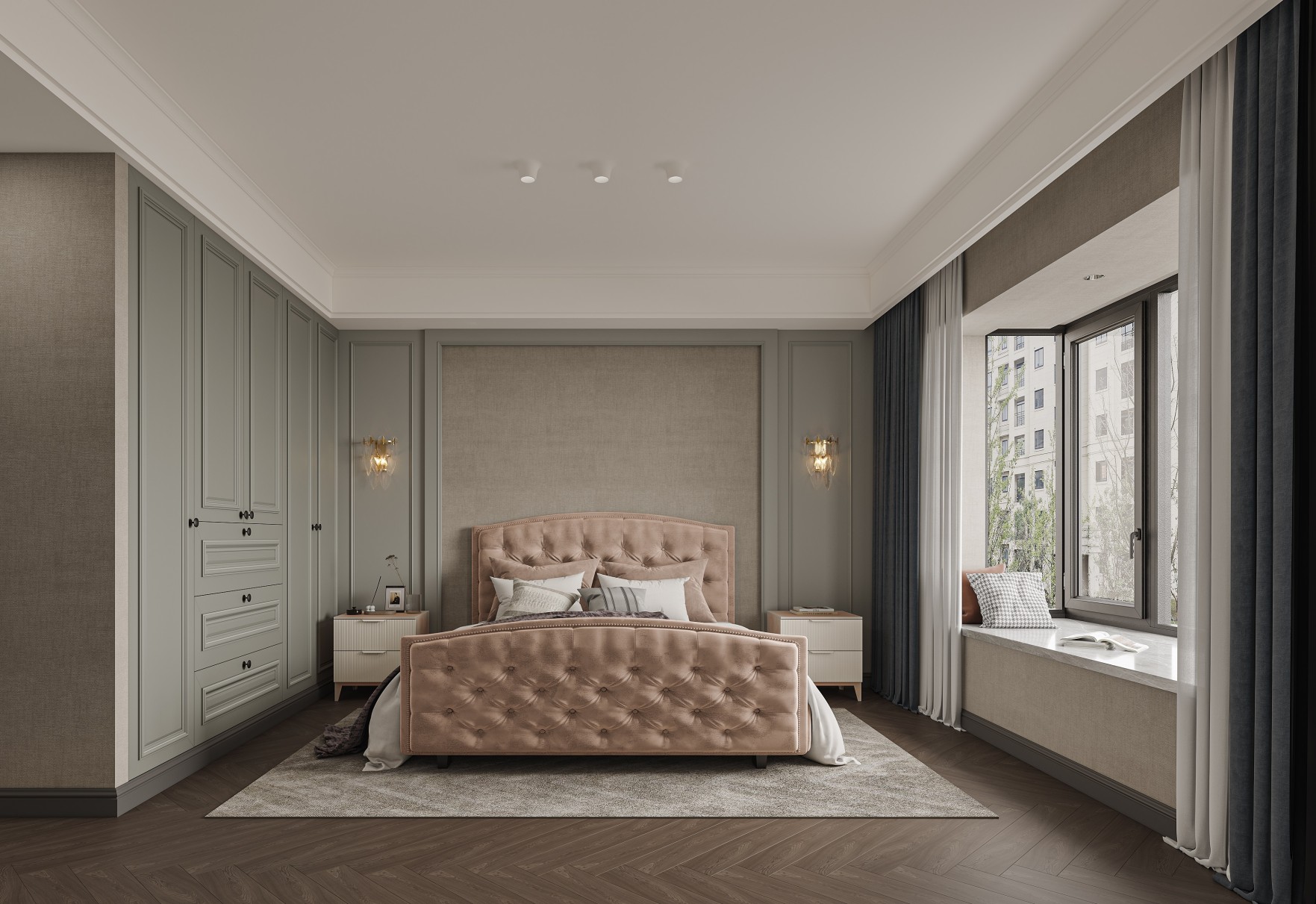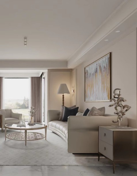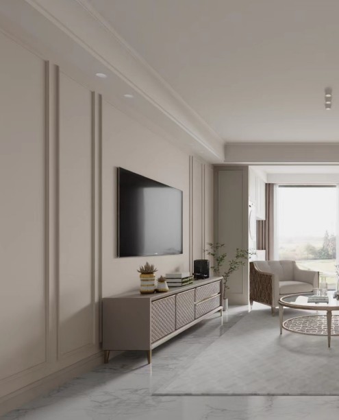 在这个设计成美式风格的高层住宅空间中,整体氛围温馨而诱人。色调柔和,营造出温暖舒适的氛围。灯光柔和而环境,为整个空间洒下舒缓的光芒。 墙壁涂有浅米色,提供了中性的背景,与整体风格相得益彰。选择这种颜色增添了房间的温馨和诱人氛围。墙壁材料采用了大量的pu线条来为空间增添了层次感和趣味性。