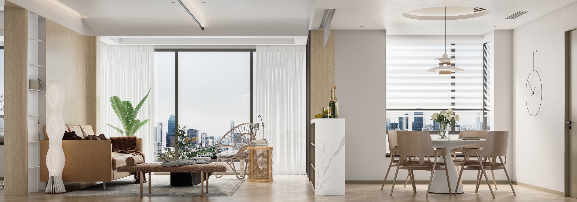 客厅和中餐厅做了半围合的形式,因为业主书籍和展示品比较多,我们在客厅设计了相当一部分展示柜,客厅去掉传统的电视机改为投影的形式,将幕布介于客厅和餐厅之间,因为投影仪是活动的,后期可以自由切换在客厅或者餐厅播放投影设备;
