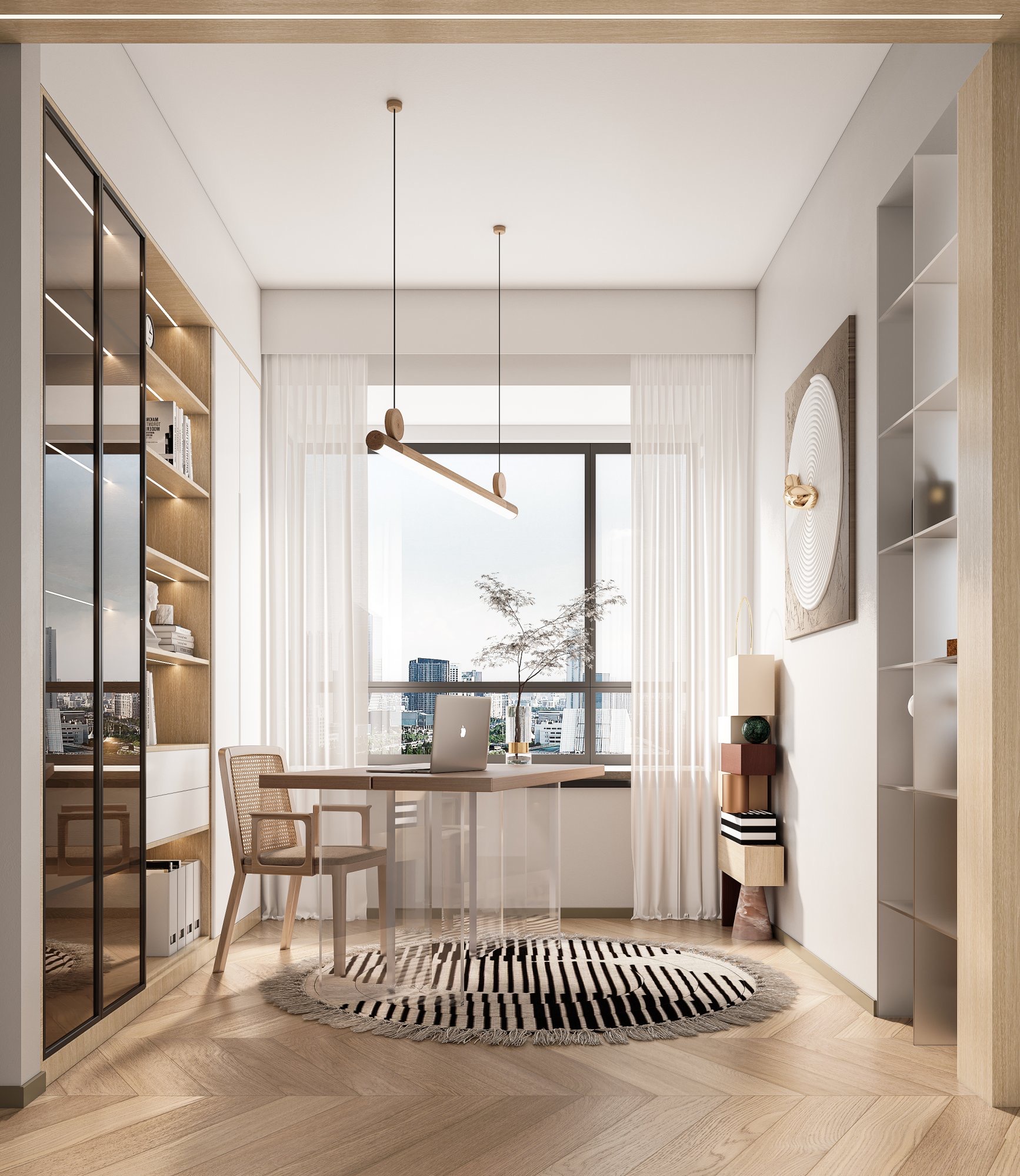 书房采用开放式的形式,因为原来过道比较狭长,开放式书房可以很大程度上弱化过道空间,和客厅之间的墙体拆除非承重墙体,用亚克力板设计成书架的形式,让客厅和书房之间有互动性;