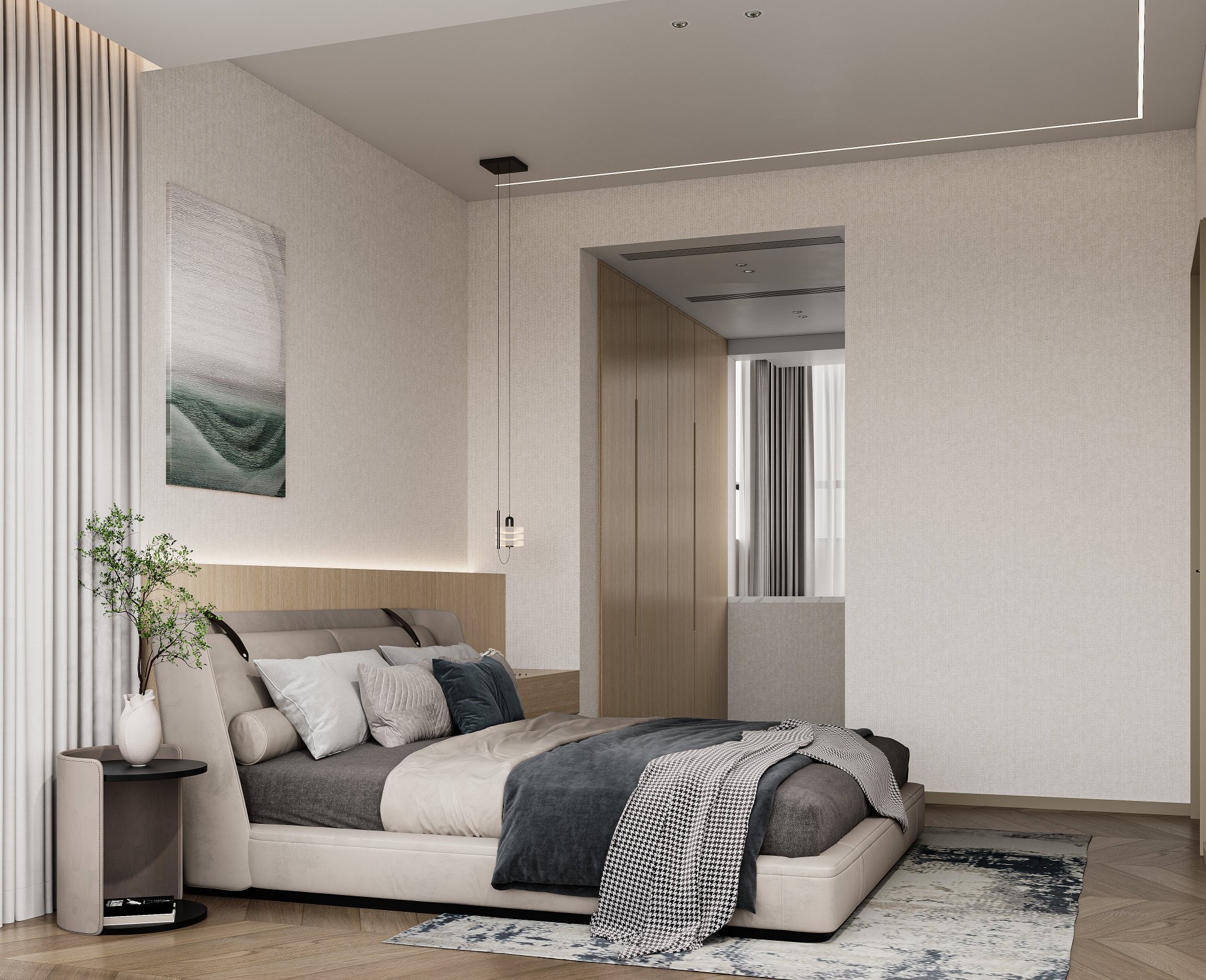 主卧设计成独立套房的形式,因为原始户型的卫生间在东西两头,跨度较大,主卧单独设计为套间后功能明确;