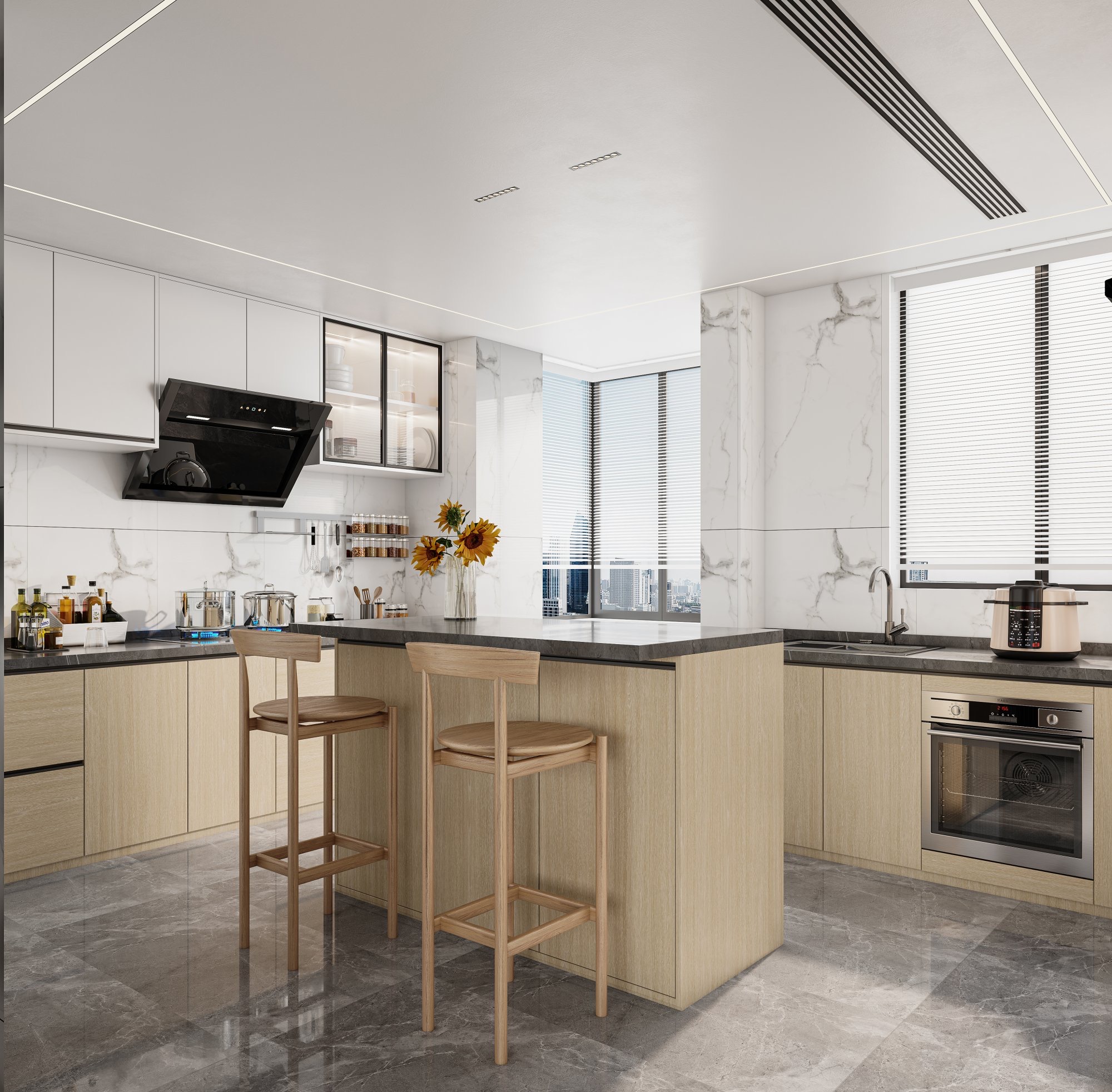 本案是一个比较长的户型,因为东边外围空间不能直接扩充到室内,所以在设计时将东边做了独立的洗衣间,厨房外围的空间扩建到室内后,改变了入户门的位置,形成了独立的玄关空间,扩充后的厨房面积比较大,做了中西厨以及简餐区,平时不会客时中间的导台也充当餐桌的功能;