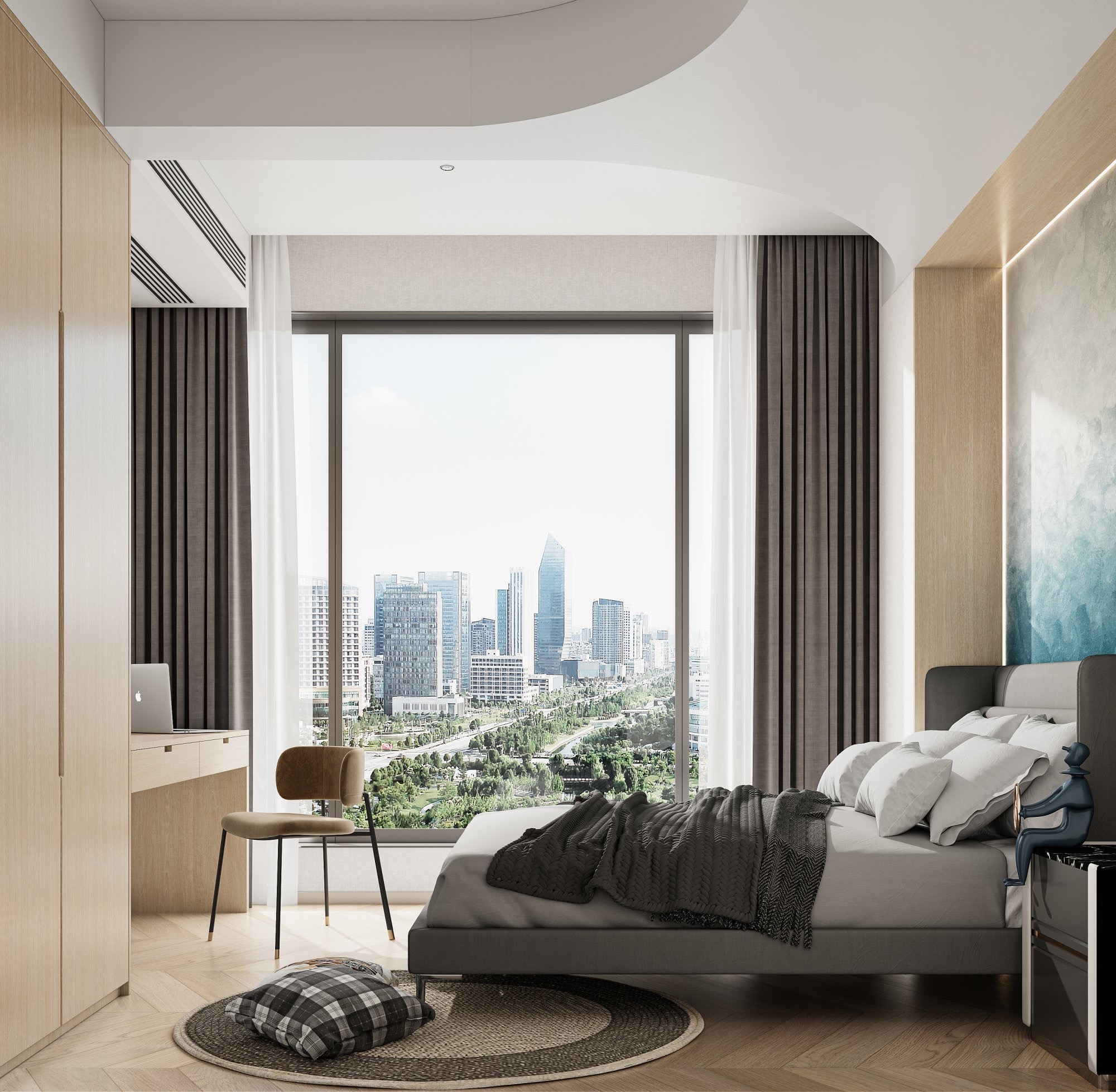 次卧空间设计的重点在床头和顶面,这个空间是男孩使用,因为床头是内凹到墙体的,所以我们在床头采用木饰面围合的形式,木饰面是比较柔和的材料,弱化了墙体的冰冷,床头采用定制壁画,渐变的色彩配上四周的氛围灯,让整个床头的墙面变成了取