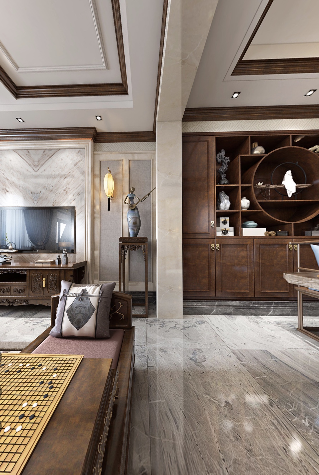 在中国文化风靡全球的现今时代,中式元素与现代材质的巧妙兼柔,唐宋家具、明清窗棂、布艺床品相互辉映,再现了移步变景的精妙小品。继承明清时期家居理念的精华,将其中的经典元素提炼并加以丰富,同时改变原有空间布局中等级、尊卑等封建思想,给传统家居文化注入了新的气息,清雅含蓄、端庄丰华的东方式精神境界的追求。